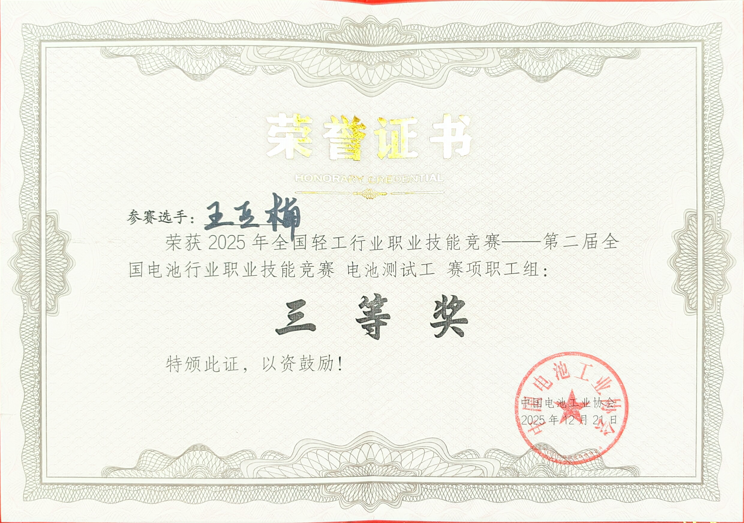 2025年12月21日,全国轻工行业职业技能竞赛——第二届全国电池行业职业技能竞赛“电池测试工”赛项全国决赛在深圳全至科技创新园圆满落幕。公司教师王亚楠历经层层选拔,从全国252名参赛选手中脱颖而出,最终以全国第13名的优异成绩斩获三等奖,展现了高校教师扎实的专业技能与行业实践能力。